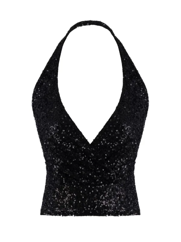 Design: Rechte zoom; Materiaal: Knitwear; Halstype: V-hals; Motief: Effen; Soort bandjes: Haltermodel; Details: Pailletten, Gedrapeerd, Wikkel design; Extra's: Glanzend; Pasvorm: Slanke pasvorm; Armlengte: Mouwloos; Lengte: Korte pasvorm