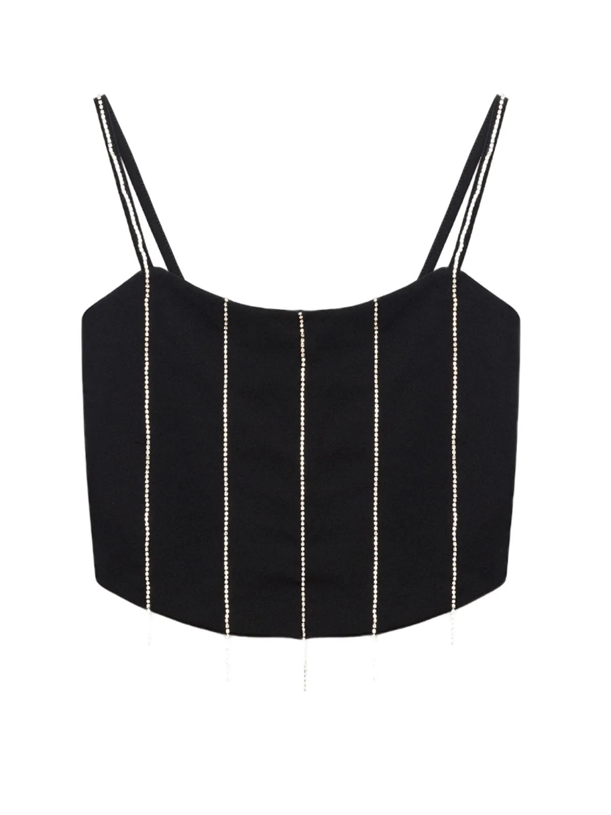 Design: Ronde zoom; Halstype: Carréhals; Motief: Gestreept; Soort bandjes: Spaghettibandjes; Details: Franjes, Sierstenen; Extra's: Glitterend, Applicaties; Pasvorm: Slanke pasvorm; Armlengte: Mouwloos; Lengte: Korte pasvorm