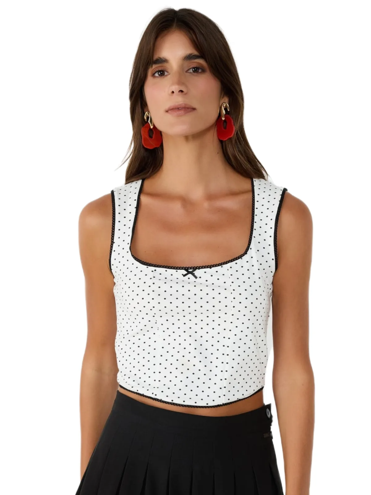 Design: Gevoerde zoom/rand, Diepe snit/decolleté; Materiaal: Jersey; Halstype: Ronde hals; Motief: Gestippeld; Soort bandjes: Brede bandjes; Extra's: All-over patroon, Applicaties, Voelt zacht aan; Pasvorm: Slanke pasvorm; Armlengte: Mouwloos; Lengte: Korte pasvorm