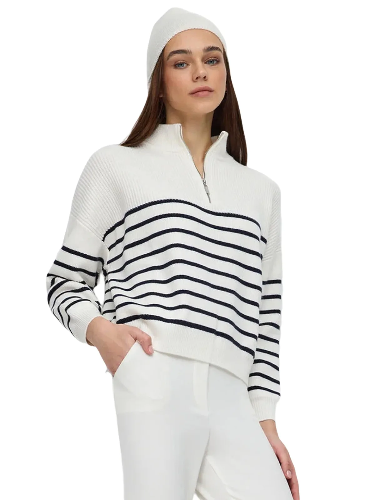 Design: Geribbelde kraag, Geribd ceintuurtje, Overcut schouder, Halve rits; Type sluiting: Ritssluiting; Materiaal: Knitwear; Halstype: Schipperskraag; Motief: Gestreept; Extra's: All-over patroon, Fully fashioned, Voelt zacht aan; Pasvorm: Losse pasvorm; Armlengte: Lange mouw; Lengte: Normale lengte