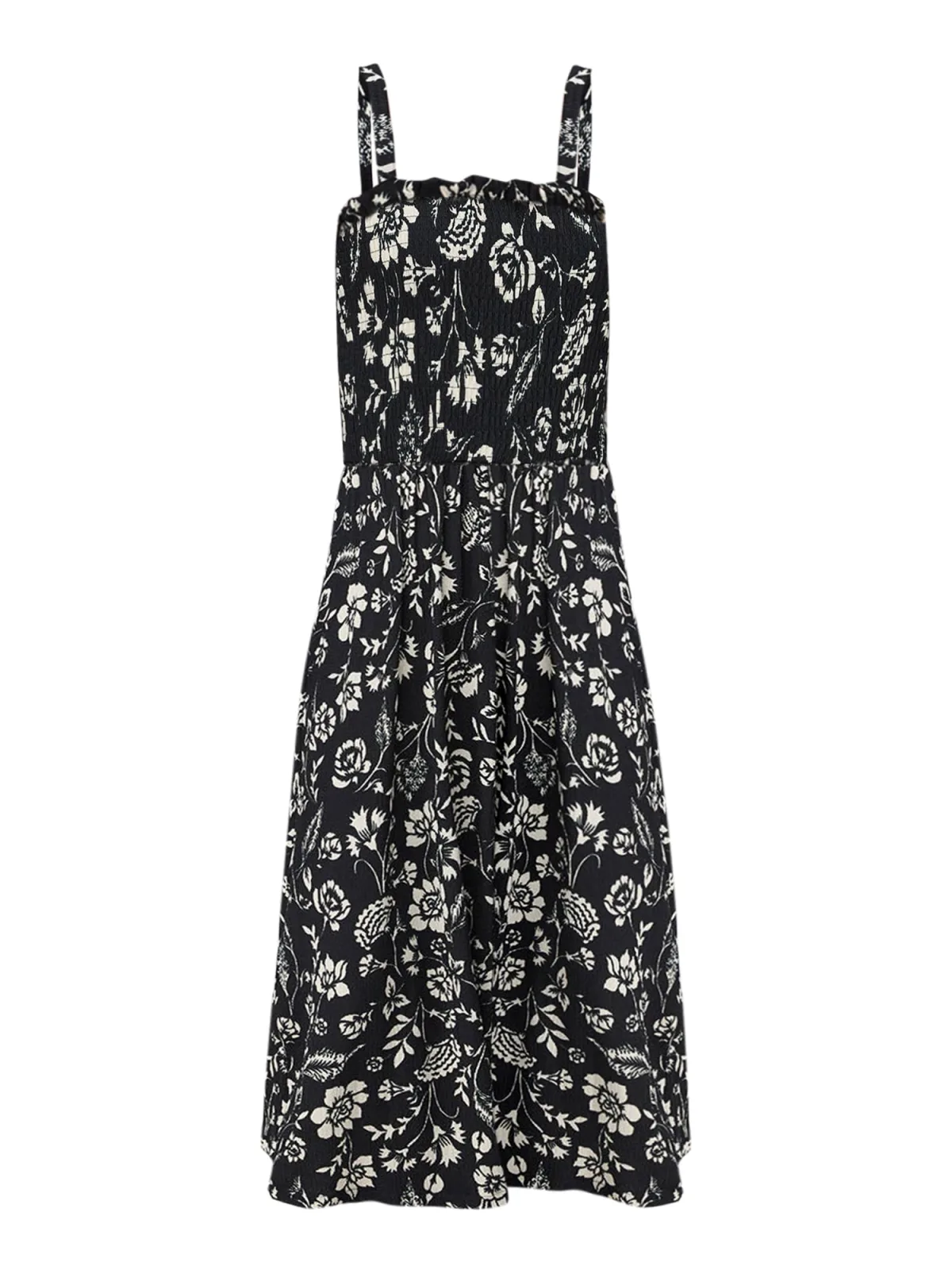 Design: Gevoerde zoom/rand; Halstype: Carréhals; Motief: Bloemenprint; Soort bandjes: Normale bandjes; Details: Ruches, Gedrapeerd; Extra's: All-over patroon, Voelt zacht aan; Lengte: 7/8 lengte; Snit: Getailleerd; Pasvorm: Normale pasvorm; Armlengte: Mouwloos