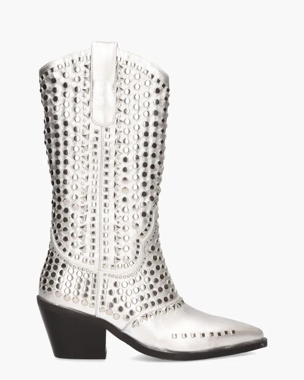 Boots voor dames Jedet van het merk Noa Harmon. Deze Westernlaars op een spitse leest heeft een zilverkleurig lederen upper. De zilveren studs geven de boots extra style. De binnenzijde is in textiel met een vast lederen voetbed uitgevoerd. De schuine hak meet ongeveer 6,5 cm en de boots sluiten met een rits aan de zijkant van de circa 30 cm
