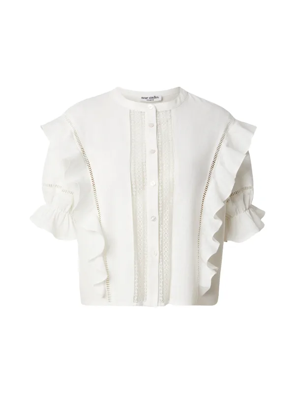 Blouse type: Klassieke blouse; Materiaal: Linnen; Motief: Effen; Kraag: Button-down; Details: Ruches; Pasvorm: Normale pasvorm; Armlengte: Halve mouw; Lengte: Normale lengte