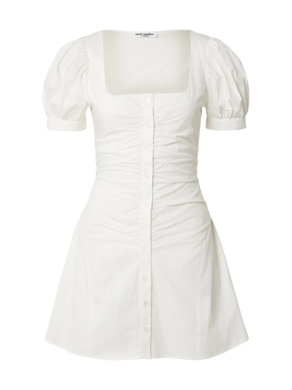 Design: Knop placket, Pofmouwen; Materiaal: Katoen; Halstype: Carréhals; Motief: Effen; Details: Ruches, Plooien; Lengte: Kort/mini; Snit: Getailleerd; Pasvorm: Aansluitende pasvorm; Armlengte: Kwartmouw
