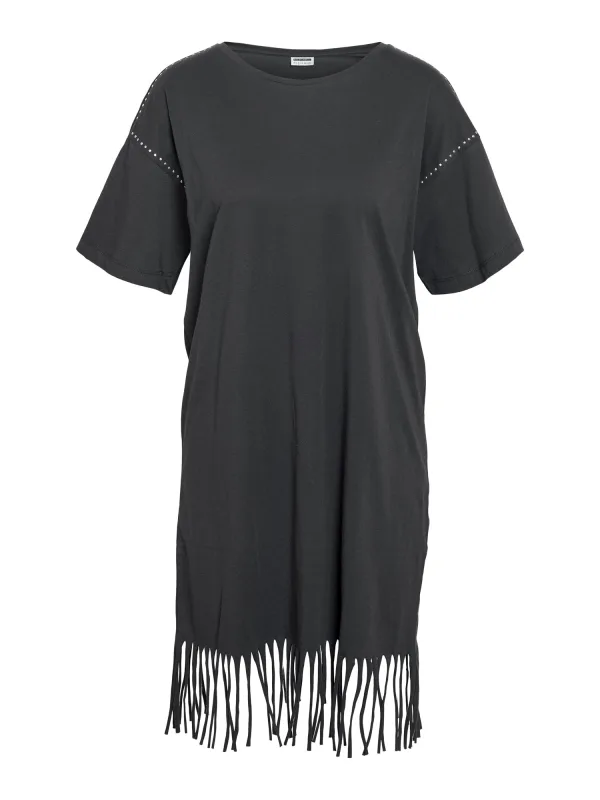 Design: Gefranjerde zoom, Overcut schouder; Materiaal: Katoen; Halstype: Ronde hals; Motief: Effen; Details: Franjes, Sierstenen; Extra's: Glitterend, Voelt zacht aan; Lengte: Kort/mini; Snit: Recht; Pasvorm: Losse pasvorm; Armlengte: Halve mouw