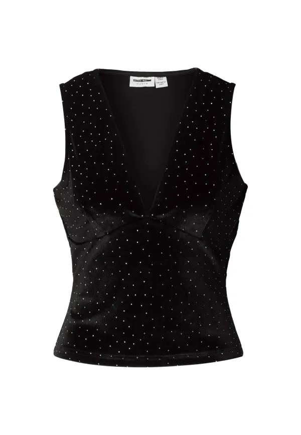 Design: Gevoerde zoom/rand, Rechte zoom; Materiaal: Fluweel/Nicky Velours; Halstype: V-hals; Motief: Effen; Soort bandjes: Brede bandjes; Details: Sierstenen; Extra's: Met textuur; Pasvorm: Slanke pasvorm; Armlengte: Mouwloos; Lengte: Korte pasvorm