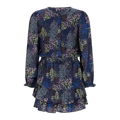 Deze NONO jurk heeft lange rechte mouwen en een ronde hals. De Miggy jurk is gemaakt van 100% polyester en sluit met een drukknoop. Smockwerk en volant geven je look net wat extra’s.