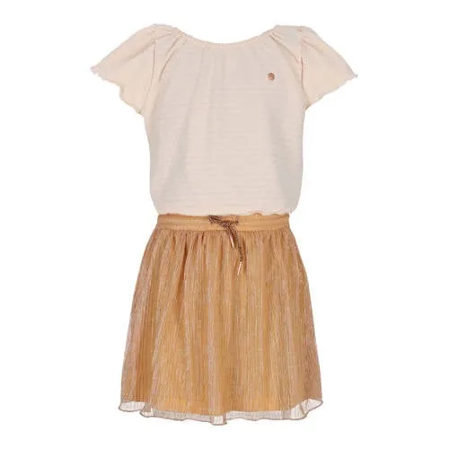 Laat haar stralen in deze NONO meisjes jurk Mena in licht zalmroze met goudoranje accenten. De jurk heeft een meerkleurige print en een subtiel semi-transparante textuurlaag, waardoor het een luchtige en speelse uitstraling krijgt. De ronde hals en korte, wijde mouwen geven genoeg bewegingsvrijheid voor een actieve dag, terwijl de soepel vallende stof prettig aanvoelt op de huid.Speelse details voor elke dag Licht zalmroze met goudoranje print voor een frisse, vrolijke look Korte, wijde mouwen voor een luchtig en comfortabel gevoel Elastische tailleband met koord voor een aansluitende pasvorm en extra draagcomfort Semi-transparante textuur geeft een speels laagje over de jurk Zonder zakken, waardoor de jurk mooi slank naar beneden valt Geschikt voor peuter, kleuter, schoolkind en tiener Wasbaar op 30 graden en lauw strijkbaarVan speelafspraak tot feestjeDe Mena jurk past goed bij allerlei momenten. Combineer met sandalen voor een zomerse dag op het schoolplein of met sneakers voor een meer preppy look. De elastische tailleband zorgt dat de jurk goed blijft zitten, ook als ze rent, danst of speelt.NONO: speelse mode voor girlsNONO staat bekend om kinderkleding met kleur, verfijnde details en een eigenwijze twist. De collecties zijn ontworpen voor meiden die graag combineren en zich vrij willen bewegen. Met deze Mena jurk van NONO kies je voor een doordacht ontwerp dat er niet alleen mooi uitziet, maar ook praktisch is in het dagelijks leven.Een vrolijke jurk waar ze zich de hele dag prettig in voelt.