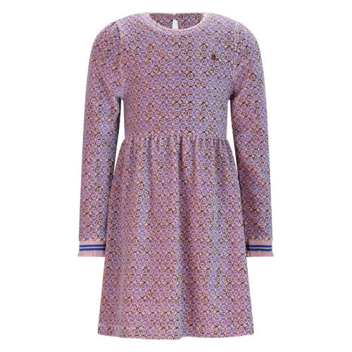 Deze jurk van NONO heeft lange rechte mouwen en een ronde hals met knoopsluiting. De kleur is blauw met lila, de jurk heeft een midi lengte en is gemaakt van katoen, polyester en elastaan.