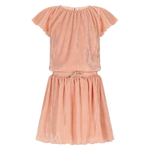 Deze zalmroze NONO meisjes jurk Mena is geschikt voor meiden die graag een jurk met een verzorgde uitstraling dragen en zich toch vrij willen bewegen. De zachte glans in de stof geeft een subtiel sprankelend effect, terwijl de soepele pasvorm geschikt is voor alledaags gebruik en feestelijke momenten. De jurk valt op midi lengte en heeft een ronde hals, waardoor de jurk makkelijk te combineren is met favoriete sneakers of sandaaltjes.Zachte glans en speelse details Gemaakt van 95% polyester en 5% elastaan voor een soepel en licht elastisch gevoel Zalmroze kleur met glimmende textuur voor een subtiel opvallende look Vlindermouwen met korte lengte voor extra bewegingsvrijheid rond de schouders Elastische tailleband met koord voor een goede, verstelbare pasvorm Effen ontwerp zonder zakken voor een rustige en moderne uitstraling Midi jurk die comfortabel rond de knieën valtComfortabel om in te spelen en te stralenDe Mena jurk is licht en luchtig, waardoor hij prettig draagt op warme dagen. De elastische tailleband blijft goed op zijn plek, ook tijdens rennen, dansen of spelen. Een legging eronder kan erbij als het wat frisser is, zodat de jurk het hele seizoen door gedragen kan worden.NONO: herkenbare stijl voor meisjesNONO staat bekend om kleding waarin meisjes zichzelf kunnen zijn. De ontwerpen combineren speelse details met praktische pasvormen, zodat de kleding geschikt is voor school, feestjes en vrije tijd. Met deze Mena jurk kies je voor een doordacht ontwerp dat er verzorgd uitziet en zacht aanvoelt.Een jurk die makkelijk aan gaat en er iedere keer weer verzorgd uitziet.