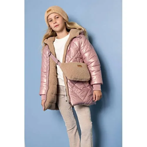 Deze jas voor meisjes van NONO heeft een capuchon en een ritssluiting. De jas is gevoerd. Met zakken aan de voorkant, geschikt voor de winter en uitgevoerd in een roze en bruine kleur.