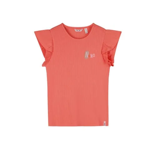 Dit T-shirt van NONO is perfect voor meisjes. Gemaakt van viscose en elastaan voelt het zacht aan. Het heeft een koraaloranje kleur, een ronde hals en korte mouwen. De ruches en textuur geven een speels accent.