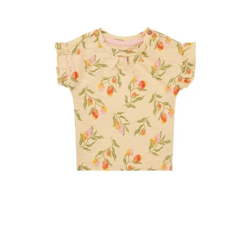 Dit Noppies baby T-shirt heeft korte mouwen en een ronde hals. Het is gemaakt van 100% katoen. Je ziet plooien en ruches aan de voorkant, de kleuren zijn beige, roze en oranje.