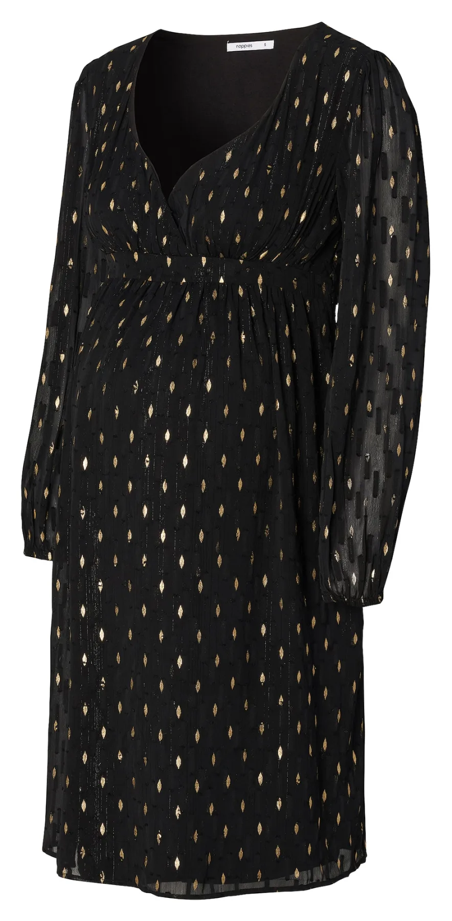 Design: Elastische inzetstukken; Halstype: V-hals; Details: Gedrapeerd, Wikkel design; Extra's: Glitterend, All-over patroon; Borstvoedingsfunctie: Met borstvoedingsfunctie; Lengte: Knielengte; Pasvorm: Normale pasvorm; Armlengte: Lange mouw