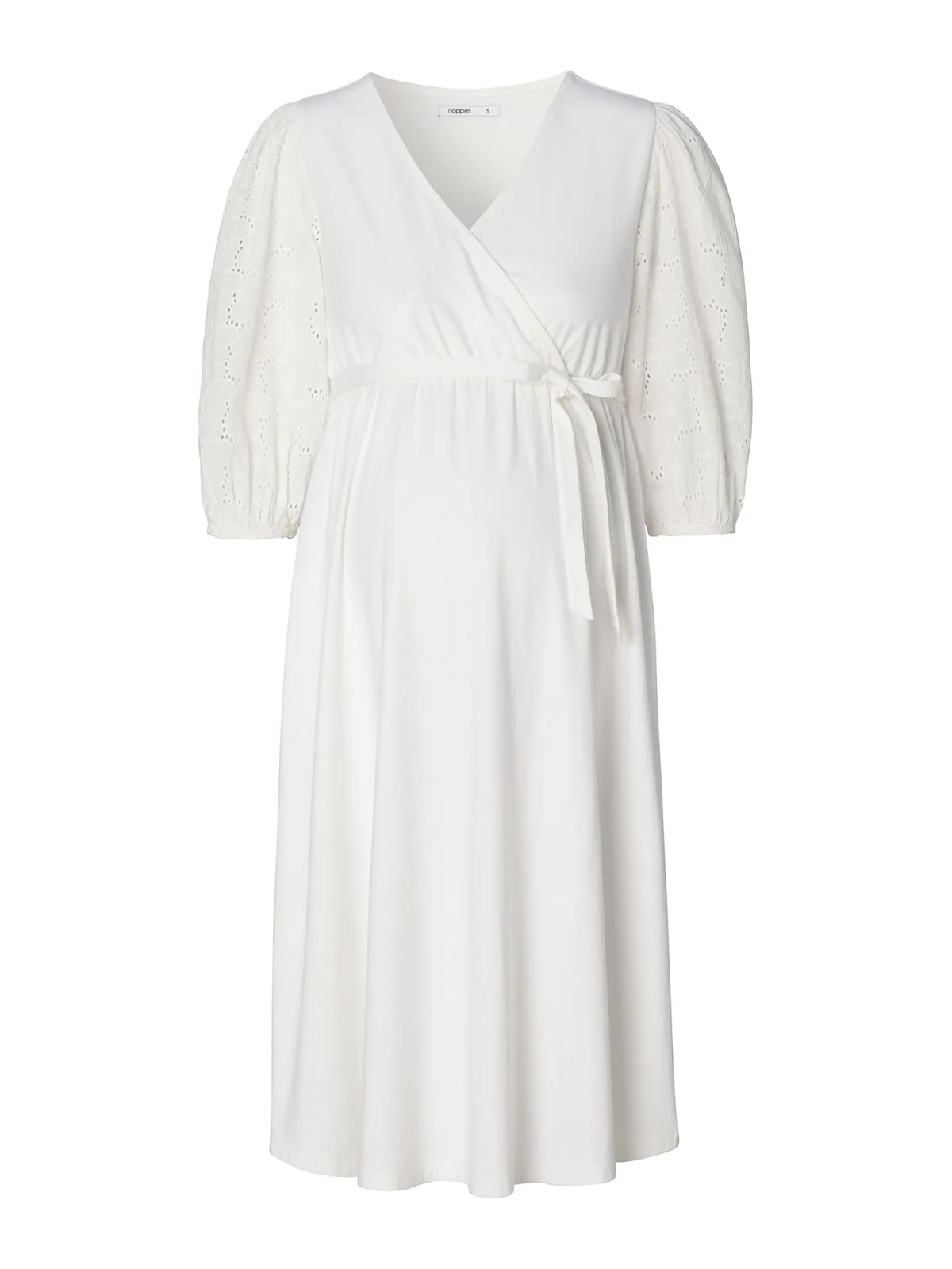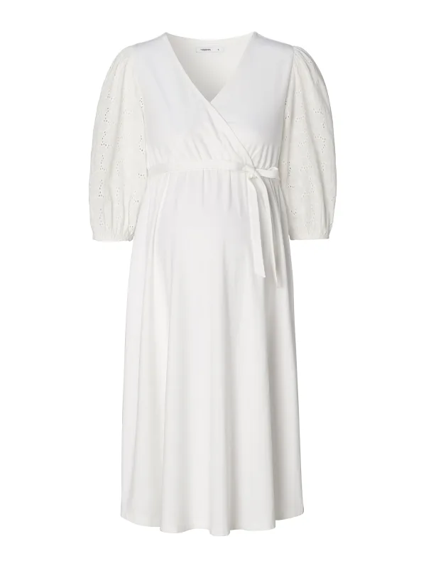Design: Gevoerde zoom/rand, Elastische taille/zoom, Wikkel-look; Materiaal: Katoen; Halstype: V-hals; Motief: Effen; Details: Borduursels, Gedrapeerd, Mesh, Wikkel design; Extra's: Op staal naden, Voelt zacht aan; Borstvoedingsfunctie: Met borstvoedingsfunctie; Lengte: Knielengte; Pasvorm: Losse pasvorm; Armlengte: Driekwart mouw