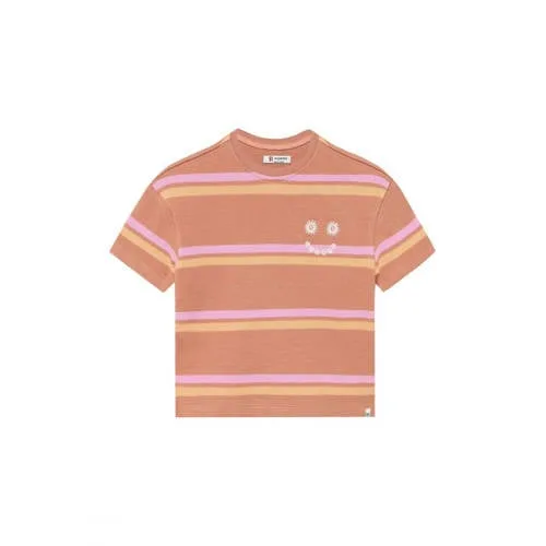 Speels, zacht en makkelijk te combineren: dit Noppies meisjes T-shirt uit de Noppies kids lijn is gemaakt voor elke dag. De lichtbruine, gele en roze strepen geven direct een vrolijke uitstraling, terwijl de subtiele borduursels zorgen voor een verzorgde look. Dankzij de rechte pasvorm en de korte mouwen voelt het T-shirt luchtig aan en kan het het hele jaar door gedragen worden, met een vestje erover of gewoon zo.Zachte kwaliteit met fijne details Gemaakt van 100% katoen, wat zacht aanvoelt op de huid en prettig draagt tijdens het spelen. Lichtbruine, gele en roze streepprint voor een frisse, kleurrijke look. Subtiele borduursels aan de voorkant geven extra detail zonder druk te ogen. Korte, rechte mouwen laten voldoende bewegingsvrijheid. Ronde hals die makkelijk over het hoofd gaat en netjes aansluit. Geen borstzak, waardoor de streepprint mooi doorloopt.Makkelijk te stylen op school en in het weekendDit T-shirt past net zo goed op een jeans als op een korte broek of rok. De zachte kleuren laten zich eenvoudig combineren met andere items in de kast, waardoor het een praktische basis is voor dagelijks gebruik, naar school of een dagje weg.Noppies kids: aandacht voor comfortNoppies staat bekend om kinderkleding die is afgestemd op actief gebruik. De Noppies kids collectie combineert doordachte pasvormen met zachte materialen en praktische details, zodat kinderen vrij kunnen bewegen en ouders kunnen rekenen op betrouwbare kwaliteit.Een praktische basis in de garderobe van elk meisje dat graag comfortabel speelt en er tegelijk verzorgd uitziet.