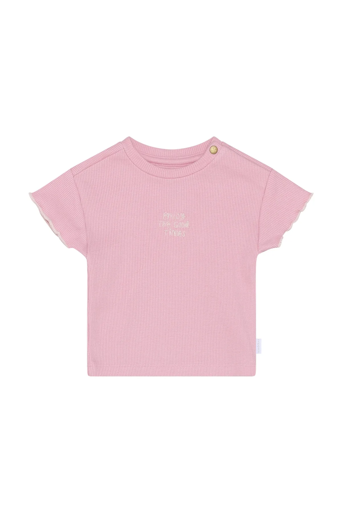 Design: Gevoerde zoom/rand, Rechte zoom, Nektape; Type sluiting: Drukknoop; Materiaal: Jersey; Halstype: Ronde hals; Motief: Tekst print; Details: Borduursels; Extra's: Label patch/label flag, Met textuur, Voelt zacht aan; Pasvorm: Normale pasvorm; Armlengte: Kwartmouw; Lengte: Normale lengte