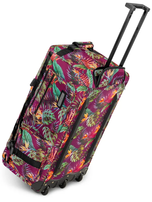 Design: Ruim hoofdvak; Type sluiting: Ritssluiting; Motief: Bloemenprint; Type tas: Reistas met wielen; Extra's: Label plaatje, All-over patroon, Label preegdruk; Maat (inhoud): Groot (> 50l); Hengsellengte: Lange schouderriemen