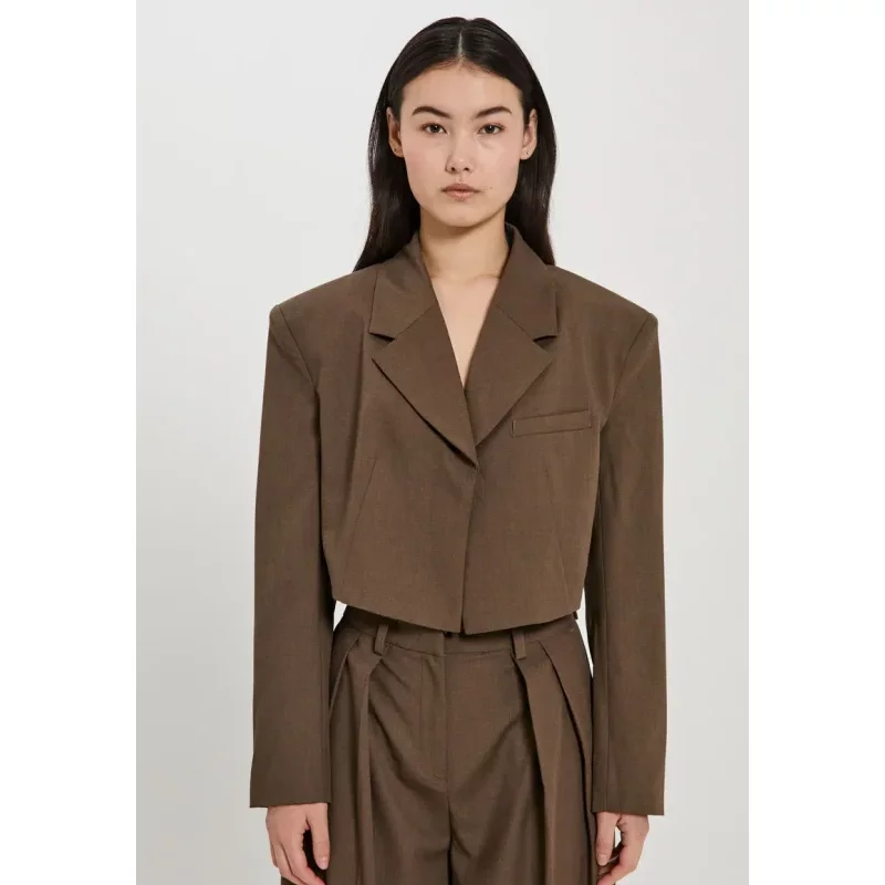 Korte blazer met schoudervulling van het merk NORR. Combineer de blazer met de kamin pants voor een matchende look. Stofsamenstelling: 90% polyester, 6% viscose, 4% elastaan. Pasvorm: valt normaal. Twijfel je over de maat? Neem contact met ons op en we helpen je graag verder!