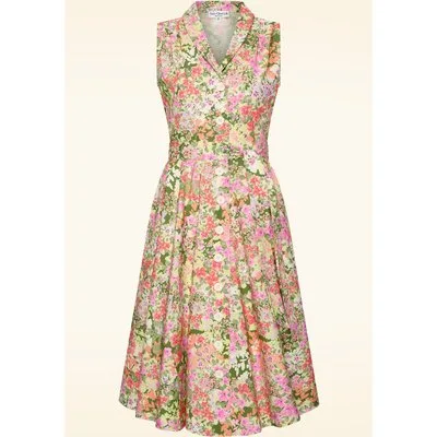 “Like a walk through Monet’s garden.” Deze zomerse jurk is een droom voor het komende seizoen! Ze is uitgevoerd in een soepele en luchtige 100% katoen (stretcht niet) en voorzien van een prachtige bloemenprint in zachte pasteltinten, geïnspireerd op de romantische kleuren van Monet’s garden. Perfect voor een frisse, vrouwelijke look op zonnige dagen. * Semi-swing model * V-halslijn met afgerond kraagje * Mouwloos * Knopenrij * It has pockets! * Afneembaar striklint voor een extra 'snatched' taille * Valt bij een lengte van 1,70 m ruim over de knie