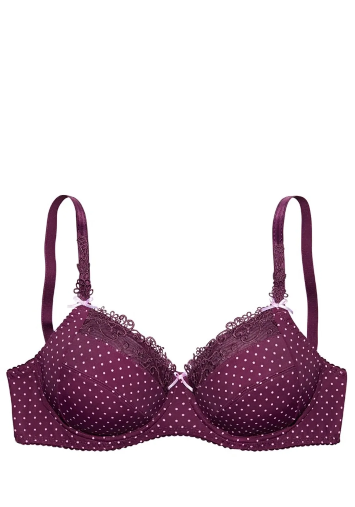 Cup soorten: Full cup bh; Soort bandjes: Normale bandjes; Bh/bikini type: T-shirt; Beugel: Met beugel; Design: Gevoerde zoom/rand; Type sluiting: Haakjes; Motief: Gestippeld; Details: Kant; Extra's: Verstelbare bandjes, All-over patroon; Pasvorm: Regular; Taillehoogte: Mid waist