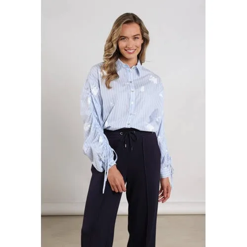 Deze NUKUS Rosa Blouse Stripe heeft lange rechte mouwen en een klassieke kraag. De blouse sluit met knopen aan de voorkant. Met streepprint en ruches langs de schouder draag je deze blouse elke dag.