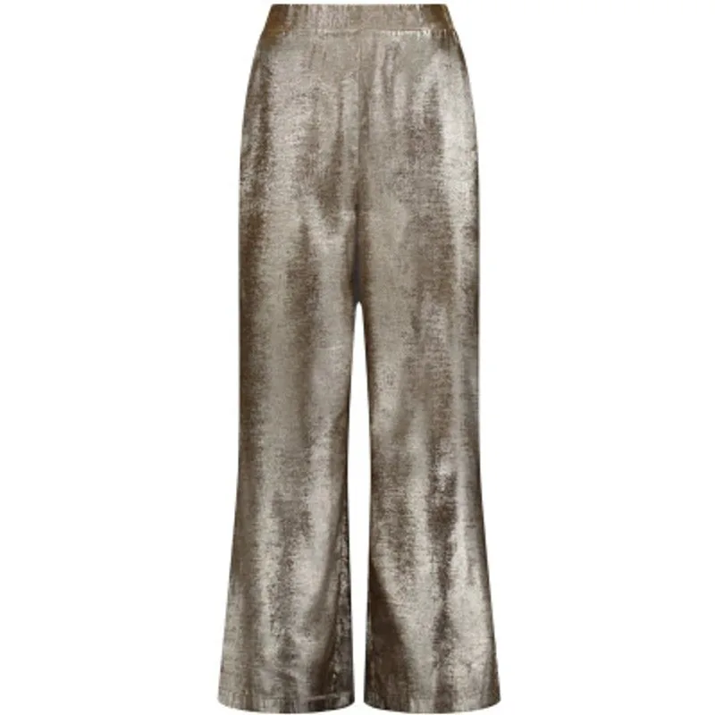 De Josephine FW230322 broek van NUKUS is een broek met elastische tailleband en wijde pijpen. De broek heeft steekzakken aan de voorzijde en is uitgevoerd in een metallic effect in de kleur Silver.