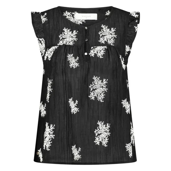 De Nukus Top NKS01051 is ontworpen met oog voor detail. Gemaakt van hoogwaardige stoffen, biedt deze top ultiem draagcomfort. De subtiele knoopsluiting en de fijne ruches rondom de schouders geven een speelse touch. Het zwarte dessin met delicate witte bloemen zorgt voor een romantische uitstraling. Deze dames T-shirt is een uitstekende keuze voor vrouwen die houden van klasse en eenvoud.