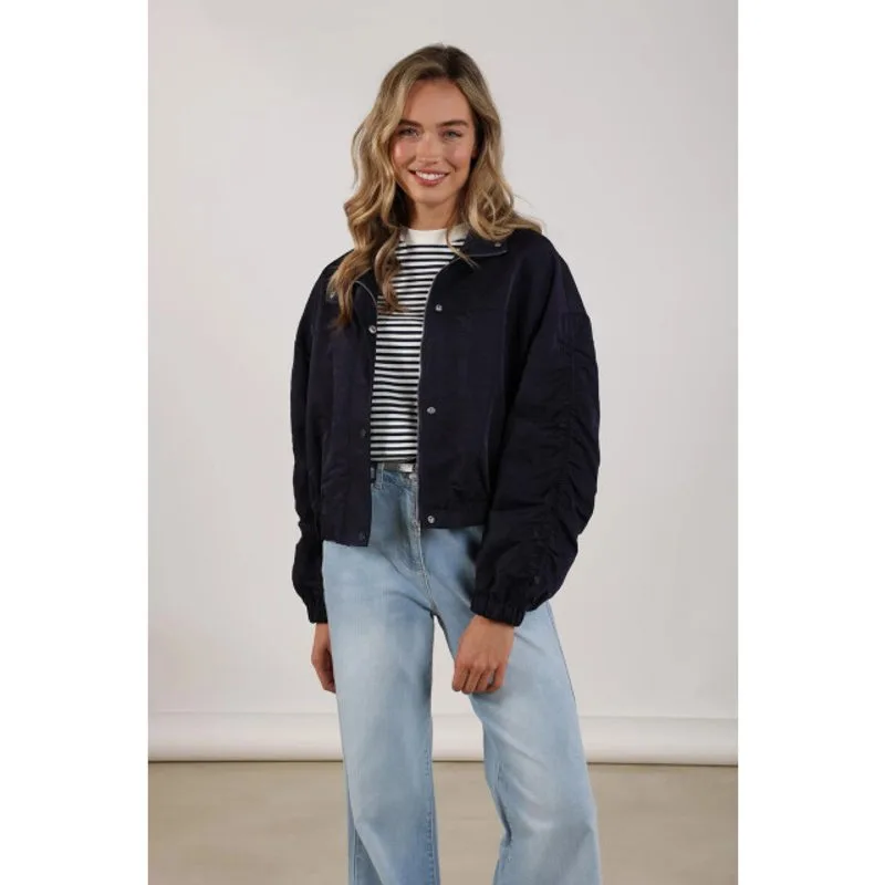 Dit navy jasje is een leuk voorjaarsjasje dat een stoere look combineert met een vrouwelijke uitstraling. Het model heeft een opstaande kraag, een ritssluiting met extra drukkers en een elastieken boord aan de onderzijde voor een nonchalant effect. Gemaakt van 100% polyamide en gevoerd met 100% polyester. Leuk te combineren met de Lisa pullover stripe en de Senna pants voor een complete outfit.Kleur: navy Materiaal: 100% Polyamide voering: 100% Polyester.