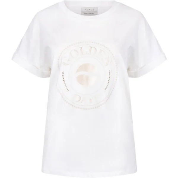 Het Ruth shirt golden van Nukus in offwhite is een frisse en luchtige top met een speels detail. Op de borst staat de gouden opdruk “golden days”, wat het shirt een subtiel glanzend accent geeft. Het 100% katoenen materiaal voelt zacht en comfortabel aan en maakt het ideaal voor het voorjaar. Dankzij de lichte pasvorm draag je het shirt makkelijk met een beige broek of jeans voor een casual, stijlvolle look. Een veelzijdig item dat eenvoudig te combineren is in je garderobe. Kleur: Offwhite/Gold Materiaal: 100% katoen