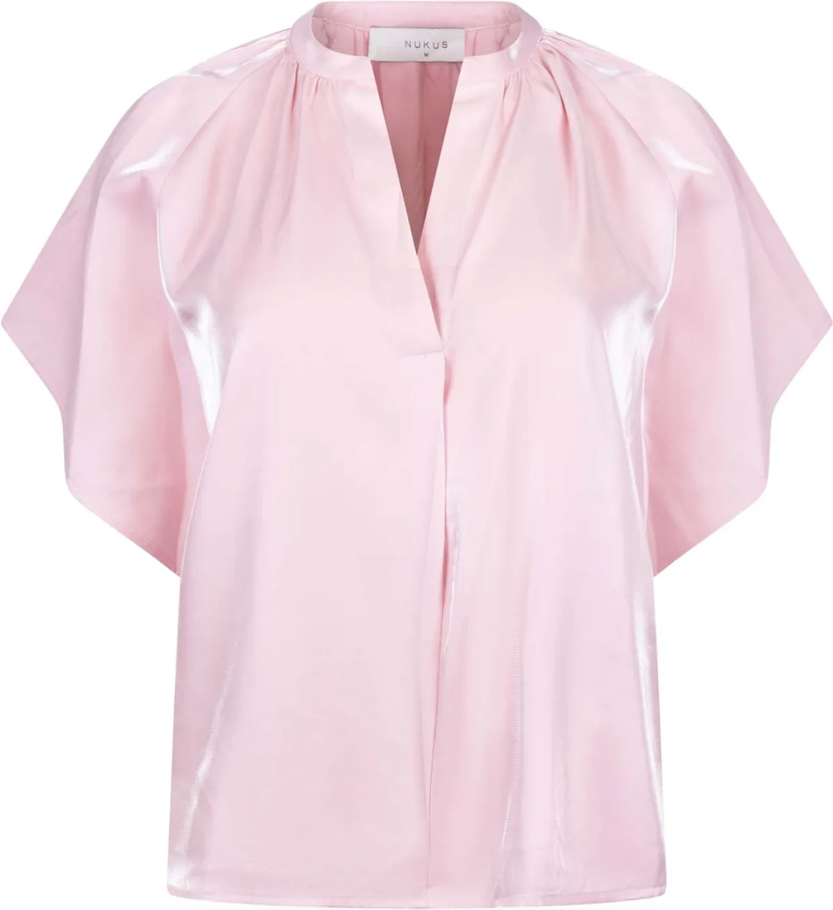 Top Taylor Shiny blouse van Nukus heeft een effen, glanzende finish met split hals en subtiele plooien bij de hals. De regular, losse pasvorm valt soepel, de korte mouw heeft een wijde, cape-achtige vorm. Sluiting: aanschuiven. Combineer met een nette broek of rok.
