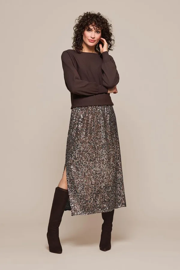 Straal elegantie uit tijdens de feestdagen met deze prachtige bronskleurige midi-rok van Mart Visser. De rok is volledig versierd met glinsterende pailletten in een warme bronskleur op een ton-sur-ton basis, wat zorgt voor een luxueus en subtiel glanzend effect. De elastische tailleband biedt een comfortabele pasvorm en maakt de rok gemakkelijk aan te trekken. Dankzij de soepel vallende, rechte snit valt hij sierlijk over de heupen en dijen. Het midi-model – net over de knie – geeft de rok een tijdloze, vrouwelijke uitstraling die zich moeiteloos laat combineren met zowel feestelijke als casual tops. Draag hem met een bijpassende blouse voor een glamoureuze look, of met een eenvoudige top voor een chique, ingetogen stijl.