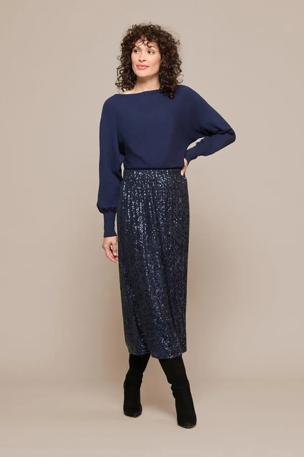 Met de navy pailletten midi-rok van Mart Visser straal je elegantie en klasse uit. De donkerblauwe pailletten zorgen voor een luxueus glanseffect, subtiel gecombineerd met de bijpassende basisstof. De elastische tailleband biedt ultiem draagcomfort, terwijl de rechte, soepel vallende snit het lichaam flatterend volgt. Het midi-model reikt net onder de knie en geeft de rok een chique en tijdloze uitstraling, ideaal voor formele gelegenheden of feestelijke events. Draag hem met de matchende blouse of tuniek voor een compleet ensemble, of kies voor een eenvoudige top voor een moderne, minimalistische look. Voeg hakken en subtiele sieraden toe om de feestelijke glans van de pailletten extra te accentueren. Door de zorgvuldige afwerking en hoogwaardige materialen blijft deze rok jarenlang een elegante keuze.