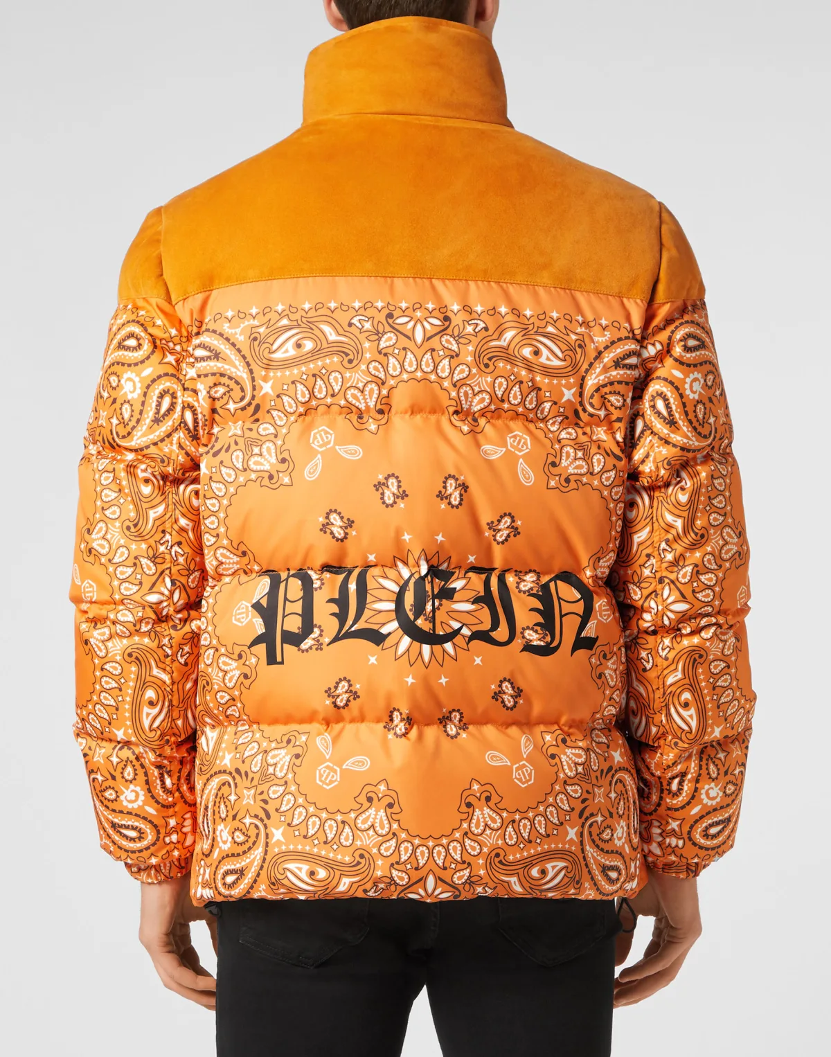 Voeg een vleugje van de stijl van Plein toe met deze nylon donsjas. Gewatteerd nylon dons Suède details Paisleyprints in bandanna-stijl PP Hexagon patch van saffiaanleer is op de linkerborst genaaid Ritssluiting Elastische manchetten Twee steekzakken met verborgen drukknoop Binnenvoering