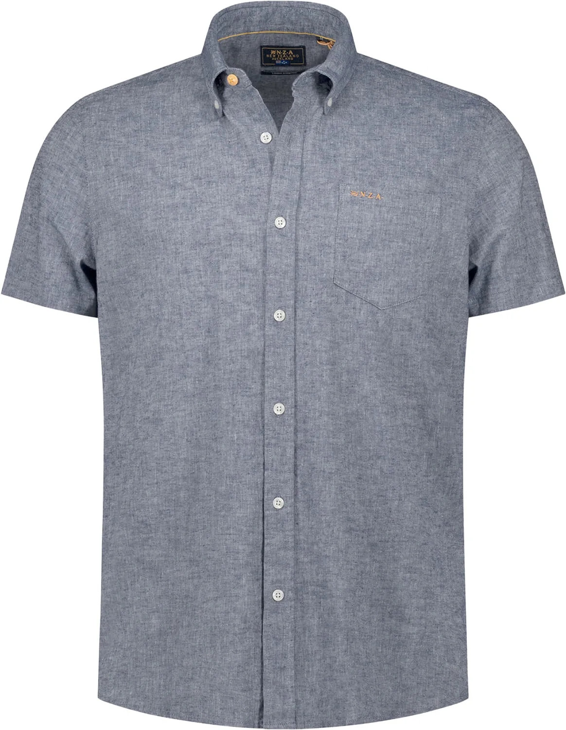Het overhemd van Nza combineert een button down kraag met een korte mouw en een effen patroon, perfect voor casual gelegenheden. Voorzien van een borstzakje en knoopsluiting, biedt dit heren overhemd km veelzijdigheid en stijl. Combineer met een vest voor een gelaagde look.