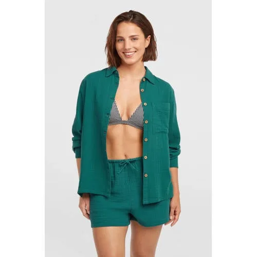 Voor zonnige dagen in de stad of ontspannen momenten aan zee is deze O'Neill blouse Brenda een lichte en praktische keuze. De dubbellaagse, ademende stof geeft de effen petrolkleur extra diepte en structuur. De blouse heeft een regular fit, valt soepel langs het lichaam en door de langere mouwen ben je net iets beter beschermd tegen een fris zomerbriesje.Luchtige laag voor zomerse dagen Gemaakt van 100% katoen, wat zacht aanvoelt en prettig ademt op warme dagen Dubbellaagse stof voor een subtiel gestructureerde look Kokosnootknoopjes aan de voorkant voor een natuurlijke, zomerse uitstraling Regular fit met zijsplitjes voor extra bewegingsvrijheid Ruime opgestikte borstzak voor een casual detail Functionele sluiting bij de mouwopening om de mouwen naar wens te stylen Klassieke kraag en effen ontwerp, makkelijk te combineren binnen je garderobe Wasbaar op 30 graden, handig voor regelmatig gebruikVeelzijdig in je zomergarderobeDe petrolkleurige blouse past goed in een zomerse dagelijkse garderobe. Door de co-ord optie combineer je deze blouse eenvoudig met bijpassende items uit dezelfde collectie voor een rustig geheel. De rechte mouwen en de knoopsluiting geven een nette basis die zowel op ontspannen als drukkere dagen van pas komt.O'Neill als vertrouwde keuzeO'Neill is bekend om kleding die comfort en een relaxte uitstraling combineert. De focus ligt op draagbare stijlen die goed aansluiten bij een actief leven, van strand tot stad. Met deze blouse kies je voor een item dat past binnen die ontspannen, praktische benadering.Een luchtige blouse die je garderobe klaar maakt voor zonnige dagen.