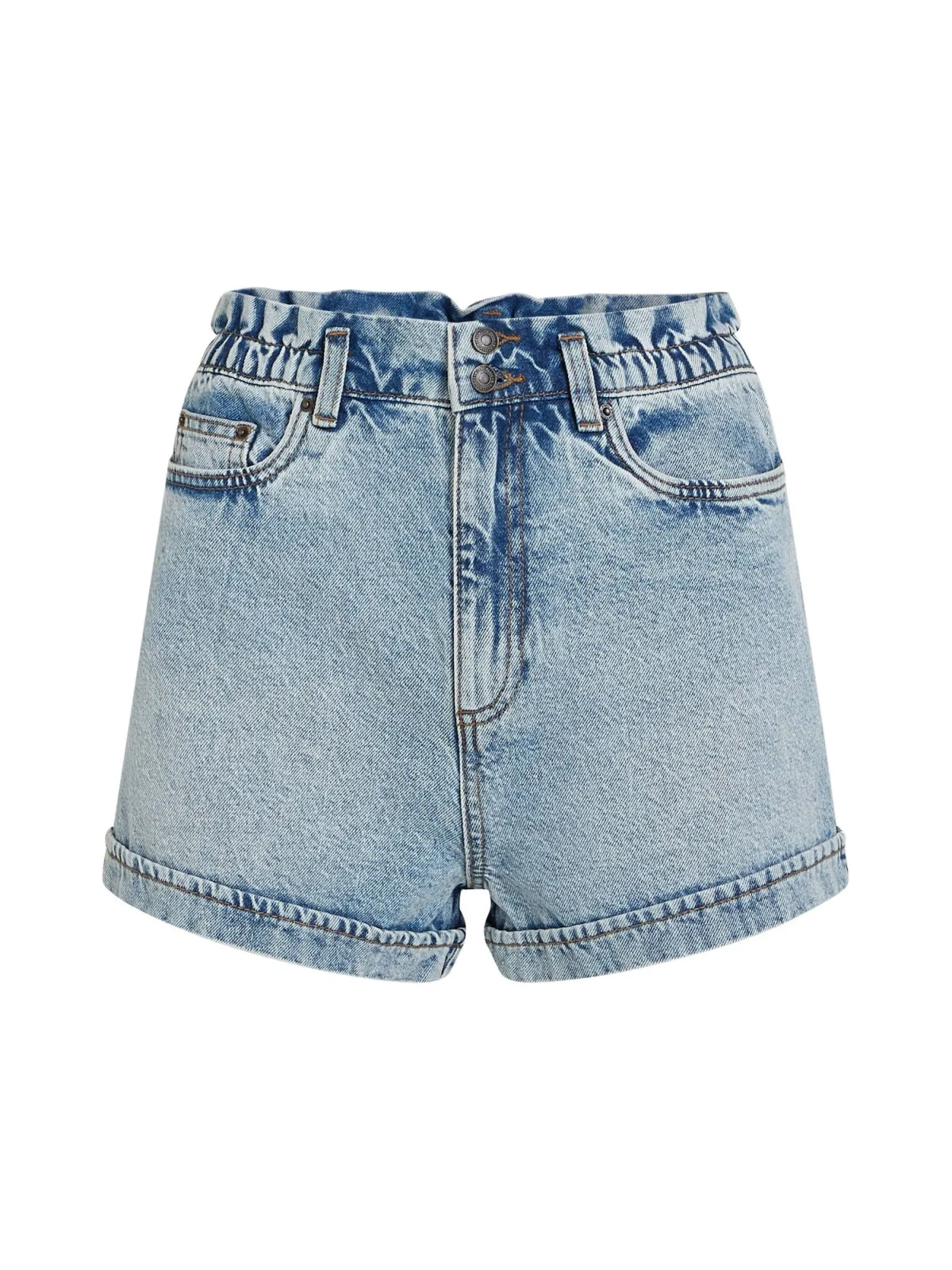 Design: Ritssluiting, 5-pocket-style; Type sluiting: Ritssluiting; Materiaal: Denim; Motief: Effen; Details: Ruches; Extra's: Gewassen effect, Riemlussen; Wassing: Acid washed; Lengte: Kort/mini; Pasvorm: Regular; Taillehoogte: High waist