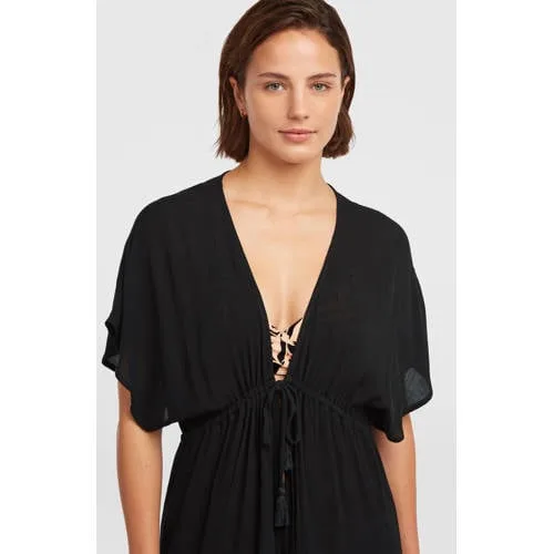 De zwarte strandjurk voor dames van O'Neill is gemaakt voor ontspannen zomerdagen. Na een surf sessie, tijdens een strandwandeling of gewoon onderweg naar de beach bar, deze middellange jurk schuif je zo over je badkleding heen. De soepele stof voelt zacht aan op de huid en valt luchtig om je heen, terwijl de elastische taille je figuur subtiel accentueert zonder strak te zitten.Luchtig model met vrouwelijke details Middellange zomerjurk in effen zwart, gemakkelijk te combineren met je slippers of sandalen Elastiek in de taille voor een comfortabele pasvorm Tunnelkoord met striksluiting en kwastjes als extra detail Wijde, korte mouwen die veel bewegingsvrijheid geven V-hals voor een open halslijn Gemaakt van 100% viscose, een soepele stof met een gladde touch Wasbaar op 30 graden, handig in het dagelijks gebruik Strandjurk zonder zakken voor een rustige, gestroomlijnde lookIdeaal voor strand, vakantie en zomerse dagenDeze strandjurk past bij allerlei zomerse momenten. Trek hem snel aan over je bikini of badpak, of draag hem met een topje eronder als luchtige zomerjurk tijdens een dagje stad. De zwarte kleur geeft een rustige basis, zodat je makkelijk kunt spelen met kleurrijke slippers of een grote strandtas.O'Neill: geïnspireerd door het strandlevenO'Neill is bekend als surfmerk met een sterke link naar het strand en de zee. De kledingcollecties zijn afgestemd op een actieve, relaxte levensstijl en bieden praktische modellen met een moderne uitstraling. Zo kun je in en rond het water dezelfde comfortabele stijl blijven dragen.Een geschikte optie als je op zoek bent naar een luchtige jurk voor de hele zomer.