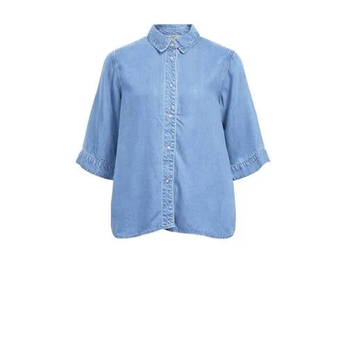 Deze 'OBJFRAME' blouse van OBJECT is voor dames gemaakt van 100% lyocell. Deze blouse heeft een klassieke kraag en half lange mouwen. De knoopsluiting zorgt voor een gemakkelijke en elegante uitstraling. Gemaakt van denim materiaal.
