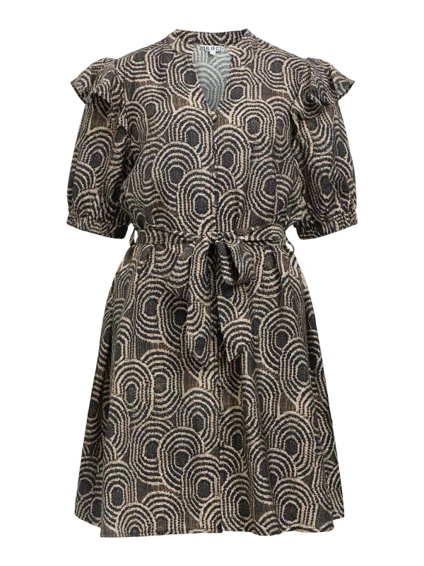 Design: Gevoerde zoom/rand, Tailleriem; Type sluiting: Knoopsluiting; Materiaal: Viscose; Kraag: Tuniek kraag; Details: Gedrapeerd; Extra's: All-over patroon; Lengte: Knielengte; Snit: Getailleerd; Pasvorm: Normale pasvorm; Armlengte: Halve mouw