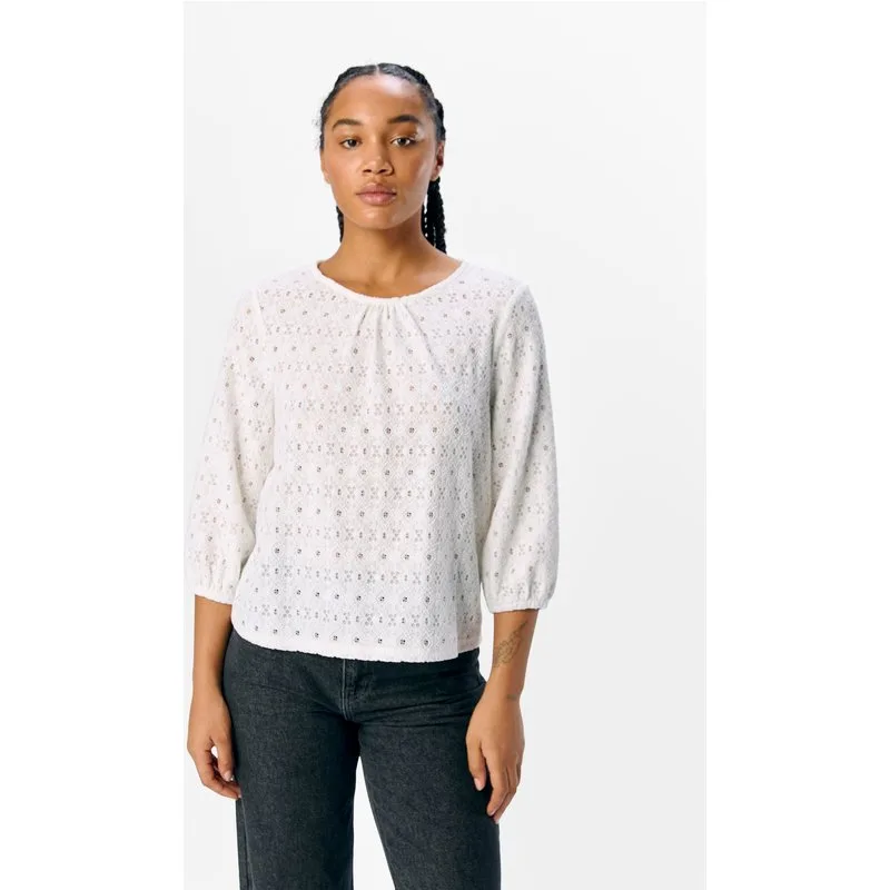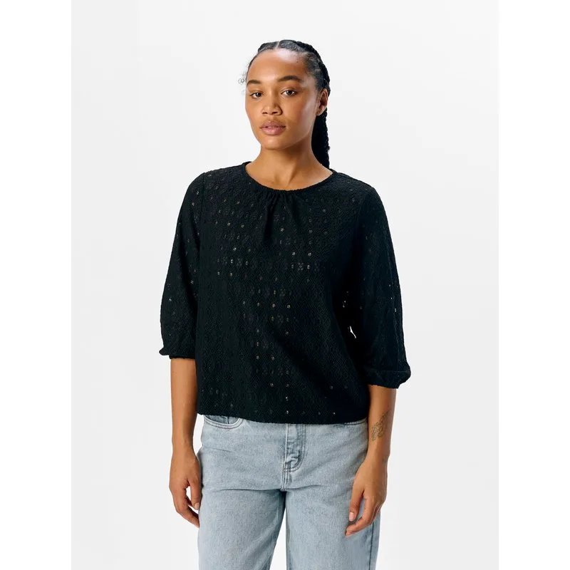 Blouse type: Blouseshirt; Design: Gevoerde zoom/rand, Rechte zoom; Materiaal: Gerecycled materiaal; Halstype: Ronde hals; Motief: Effen; Kraag: Zonder kraag; Details: Gedrapeerd, Mesh; Extra's: Licht transparant, Op staal naden, Voelt zacht aan; Pasvorm: Normale pasvorm; Armlengte: Driekwart mouw; Lengte: Normale lengte