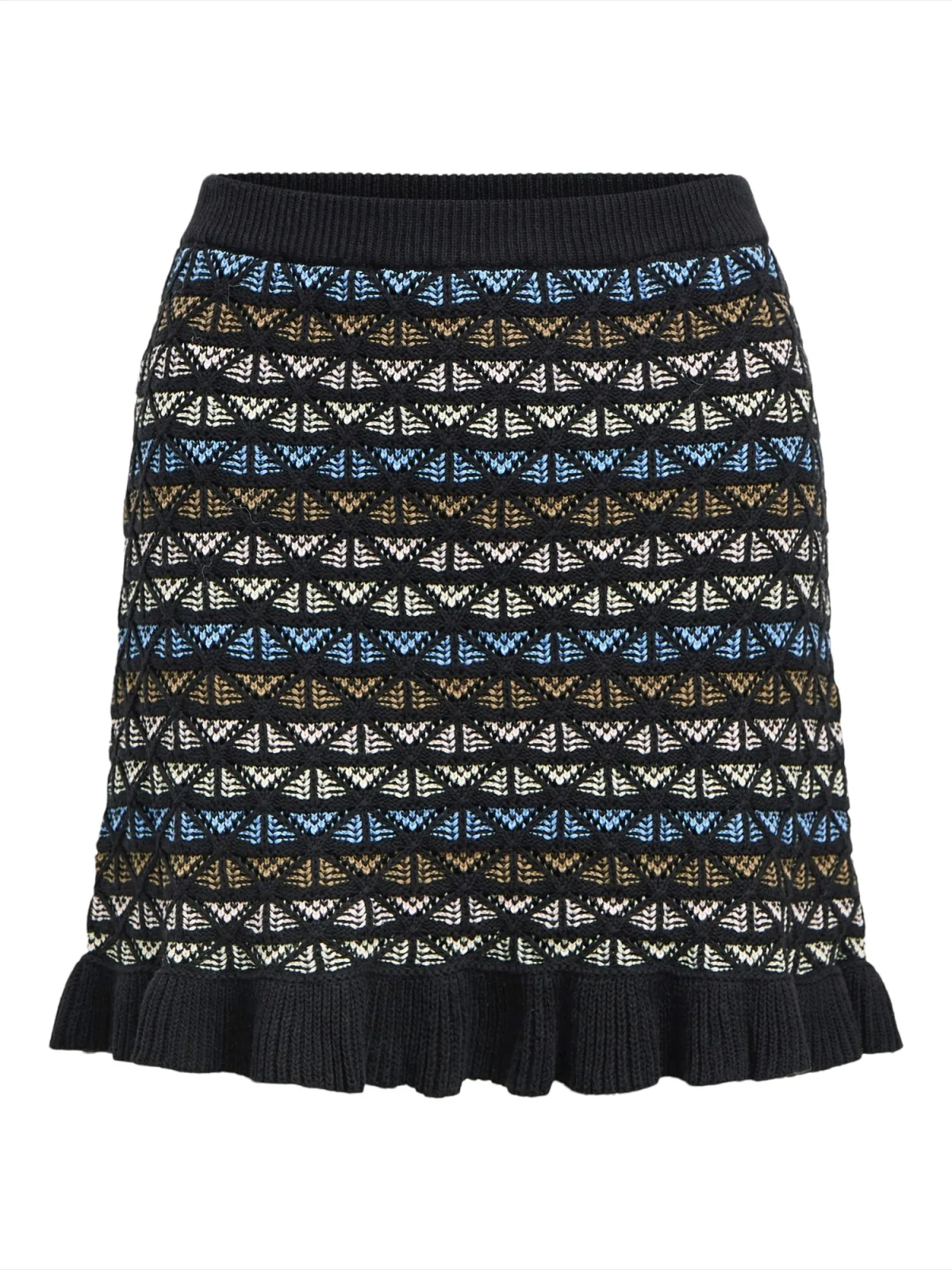 Design: Elastische taille/zoom, Geribd ceintuurtje; Materiaal: Knitwear; Rokvorm: A-lijn rok; Details: Volant; Extra's: All-over patroon, Voelt zacht aan; Lengte: Kort/mini; Pasvorm: Wijde pasvorm