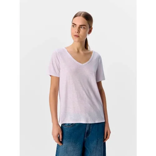 Dit T-shirt van OBJECT zal je garderobe opfrissen. Gemaakt van een mix van linnen en polyester. Het heeft korte mouwen en een V-hals. Perfect voor dames die houden van een stijlvolle look.