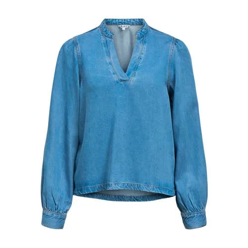 Deze lichtblauwe denim blouse met V-hals van OBJECT is een luchtige basic voor dagen waarop je er verzorgd uit wilt zien zonder veel moeite. De soepele lichtblauwe stof heeft de uitstraling van denim, maar voelt veel zachter en lichter aan op de huid. De rechte pasvorm valt losjes om je lichaam en de open V-hals geeft een vrouwelijke, ontspannen look.Zachte denimlook voor elke dag Lange trompetmouwen voor een speels silhouet met een subtiele zwier aan de onderkant Rechtvallende pasvorm die niet afklemt en prettig om het lichaam heen valt Open V-hals zonder sluiting, waardoor de top makkelijk aan en uit gaat Lichtblauwe denimlook die eenvoudig combineert met een jeans, pantalon of rok Gemaakt van een zachte, gladde stof die soepel meebeweegt Maatadvies: valt normaal, je kunt je gebruikelijke maat kiezen Onderhoud: handwas, niet strijken en niet drogen in de droogtrommelMakkelijk te stylen top voor dagelijkse outfitsVoor een ontspannen werkdag combineer je de blouse met een rechte jeans en lage schoenen. In het weekend staat de blouse goed op een wijde broek of een midi-rok. De trompetmouwen geven vanzelf iets extra’s, waardoor je verder weinig nodig hebt voor een complete outfit.OBJECT: moderne stijl met een rustige uitstralingOBJECT staat bekend om moderne, draagbare collecties met een heldere vormgeving. De modellen zijn vaak rustig uitgevoerd, waardoor je ze makkelijk combineert met wat er al in je kast hangt. Zo bouw je stap voor stap een garderobe op waar je lang plezier van hebt.Een lichte blouse waar je het hele seizoen naar grijpt zodra je een comfortabele maar verzorgde look wilt.