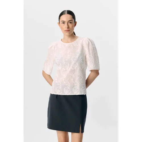 Blouse type: Blouseshirt; Design: Gevoerde zoom/rand, Keyholesluiting, Pofmouwen; Type sluiting: Knoopsluiting; Materiaal: Katoen; Motief: Effen; Kraag: Zonder kraag; Details: Cut-outs, Kant, Borduursels, Gedrapeerd; Extra's: Licht transparant, Met textuur; Pasvorm: Normale pasvorm; Armlengte: Halve mouw; Lengte: Normale lengte