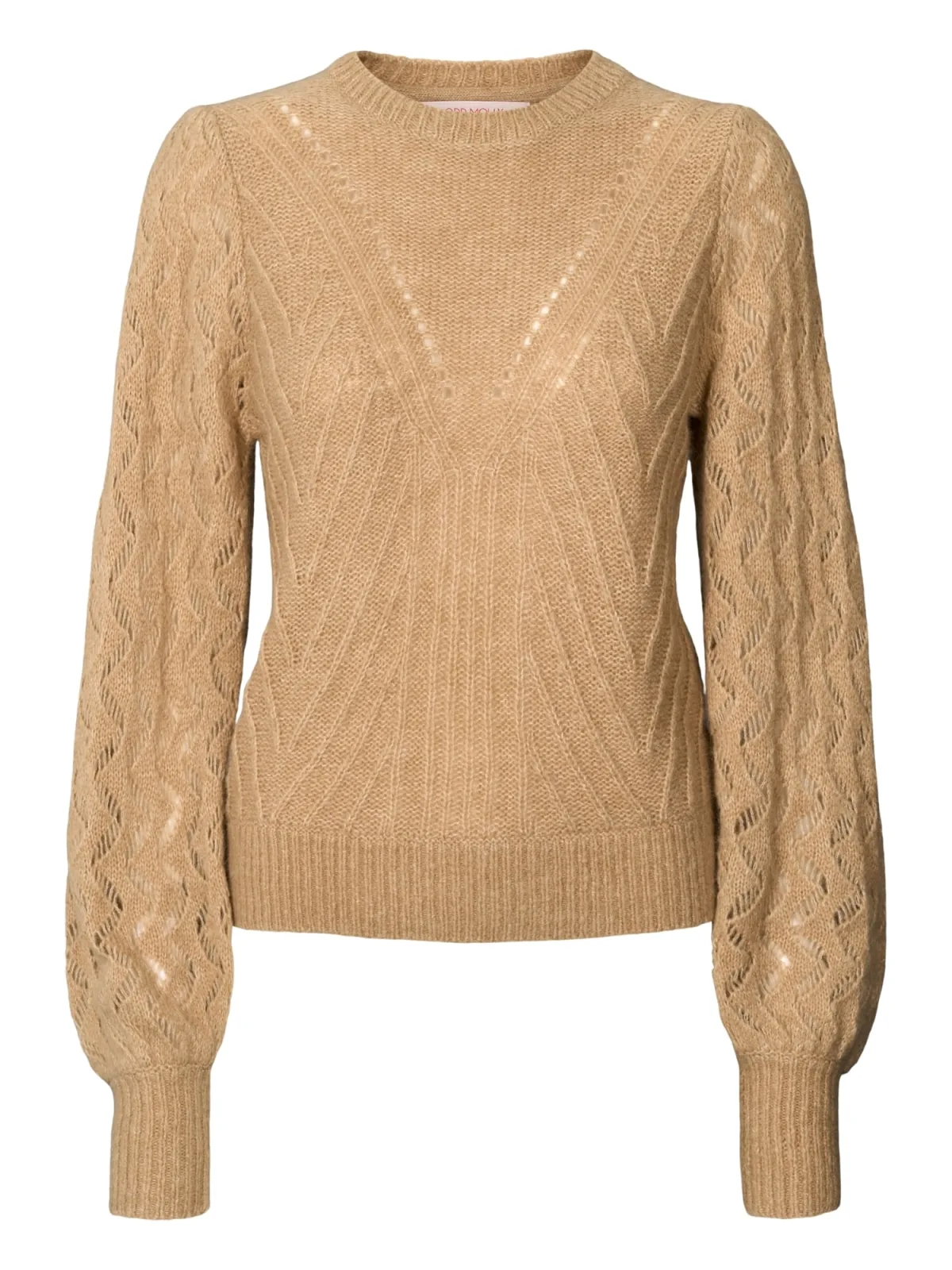 Design: Geribbelde kraag, Pofmouwen, Geribd ceintuurtje; Materiaal: Knitwear; Halstype: Ronde hals; Motief: Effen; Details: Gedrapeerd, Mesh; Extra's: Licht transparant, Fully fashioned, Voelt zacht aan; Pasvorm: Normale pasvorm; Armlengte: Lange mouw; Lengte: Normale lengte