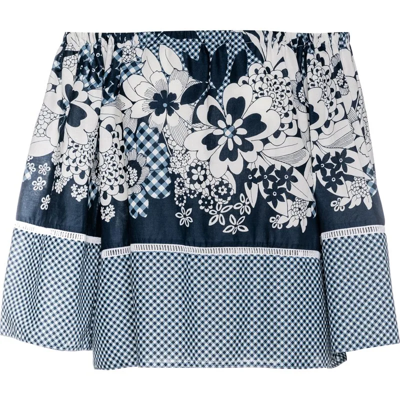 Zomertop van gebloemde en geruite stof, 100% katoen. Elastische halslijn die van de schouder kan worden gedragen. Klokmouwen met geperforeerd ecru vlechtwerk en micro-ruitjesprint onderaan. Geperforeerde witte vlecht net onder de taille en micro-ruitjesprint daaronder. A-lijn silhouet. Afmetingen voor maat S (in cm): Schouder -35; Borst-49; Taille-59; Onderkant-62; Mouwlengte-44; Lichaamslengte-47. 100% katoen.
