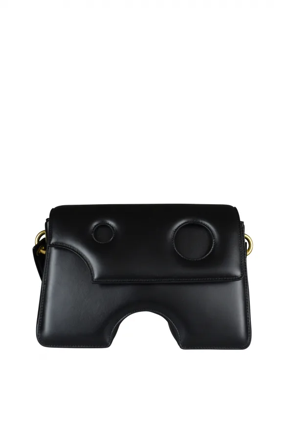 Gebroken witte schoudertas van glad kalfsleer.Burrow 22 groot model in zwarte kleur.Iconische uitsparingen over het geheel.Verstelbare leren schouderband met gesp.Gouden logo-reliëf aan de achterkant.Magnetische drukknop.Binnenzijde kaartgleuven.Rood en zwart gepolijste leren voering.Gouden afwerking.Afmetingen: lengte 32 cm x hoogte 20 cm x breedte 11 cm.Gemaakt in Italië.