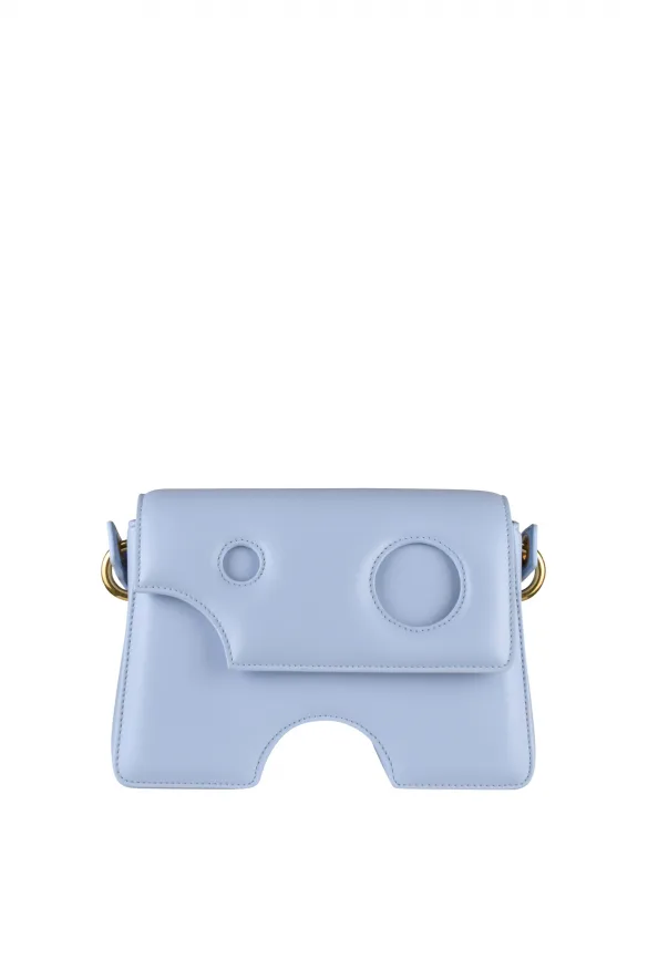 Gebroken witte schoudertas van glad kalfsleer. Burrow 22-model in lichtblauwe kleur.Iconische uitsparingen over het geheel.Verstelbare leren schouderband met gesp. Zwart logo-reliëf aan de achterkant. Magnetische drukknop. Kaartsleuven aan de binnenkant. Zwart en blauw gepolijste leren voering. Vergulde afwerkingen.Afmetingen: lengte 22 cm x hoogte 15 cm x breedte 8 cm.Gemaakt in Italië.