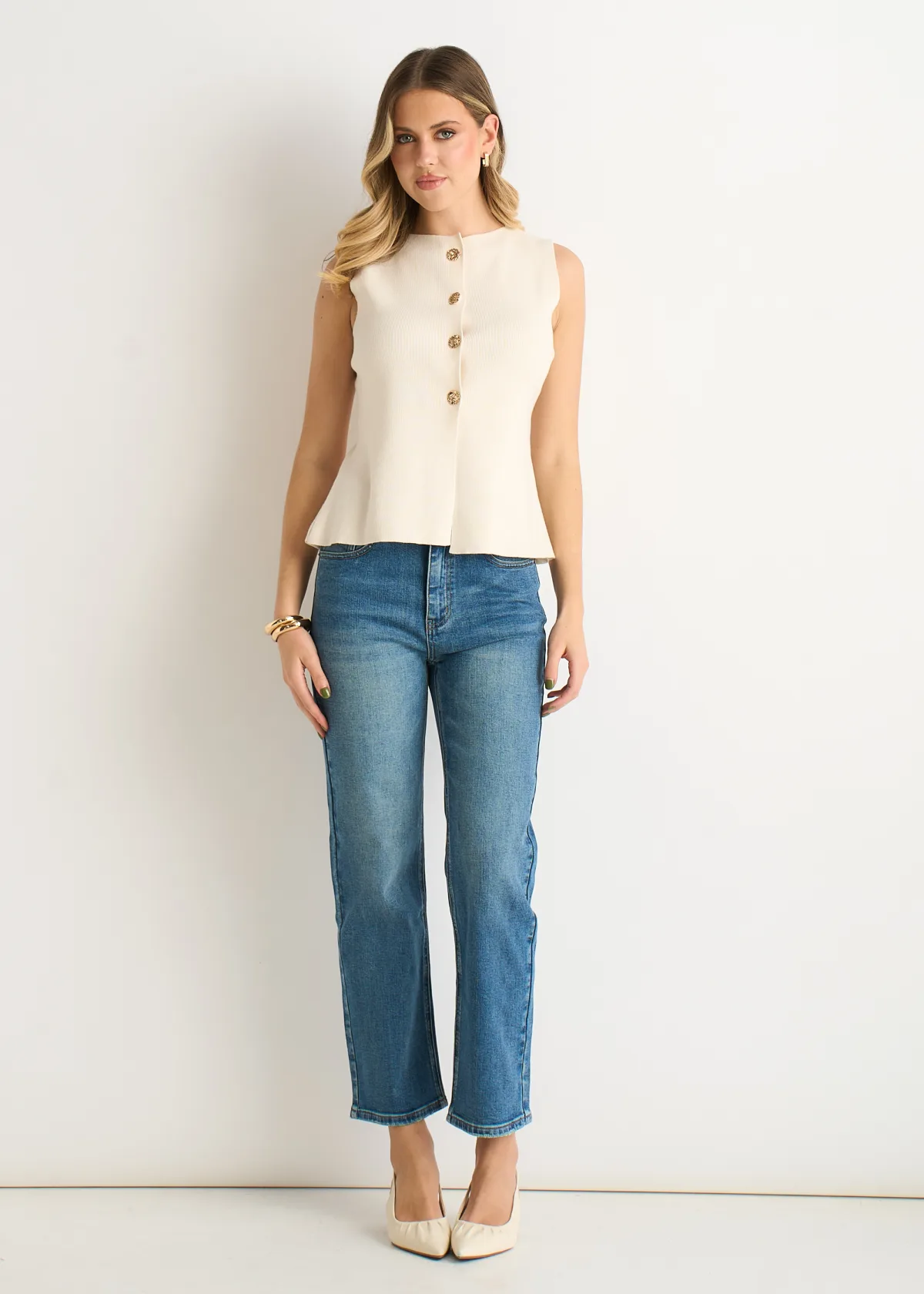 Moeiteloos combineren en ingetogen elegantie komen samen in dit gebroken witte vest met knoopsluiting. Het is gemaakt van compact gebreide stof en heeft een gestructureerd silhouet dat prachtig staat over T-shirts, overhemden of jurken. De klassieke knoopsluiting en neutrale kleur maken het een veelzijdig kledingstuk dat niet in je garderobe mag ontbreken. Draag het chic voor speciale gelegenheden of casual voor elke dag. Perfect om elke outfit meer dimensie te geven zonder dat het te veel wordt.